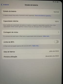 Comprei dia 20.01.26 recebi 22.01.26 O iPad veio intacta novinho em folha sem nenhuma marca de uso 1 siclo apenas de carregamento estou feliz pela compra